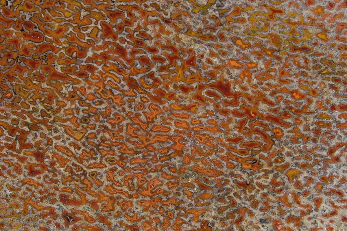 Dinosaur gembone (agatized dinosaur bone) forms when the porous structure of dinosaur bone is replaced by silica-rich minerals like agate, chalcedony, or jasper. This preserves the bone’s internal cell patterns, creating striking, web-like textures visible when polished.