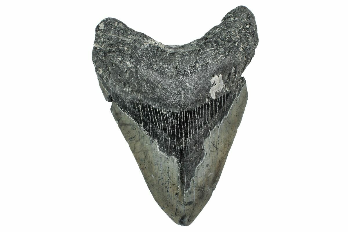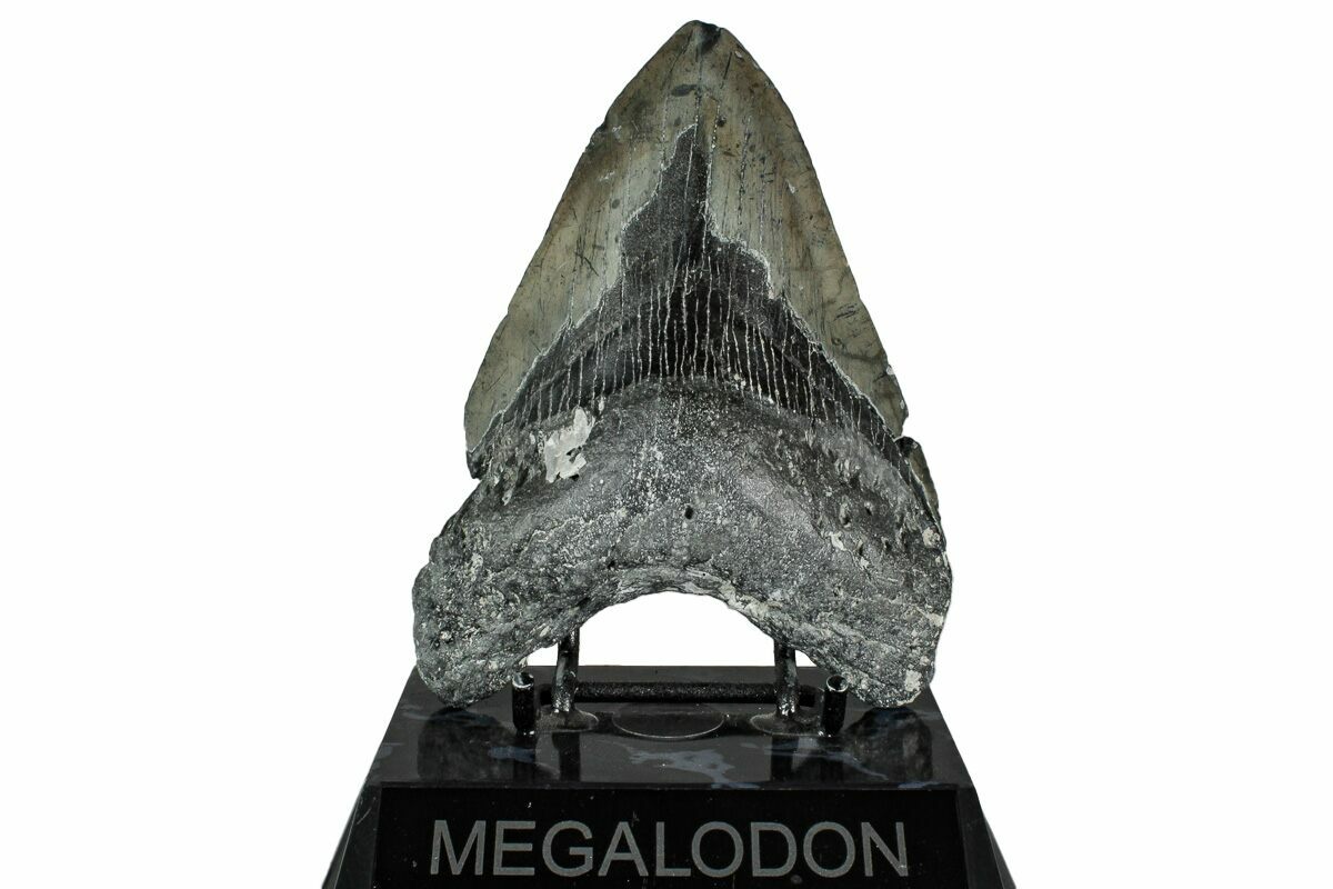 The standard measure for megalodon teeth is slant height, or the longest edge of the tooth. Adult megalodon teeth were typically in the 4 to 5 inch range: teeth over 6 inches are rare and represent super-sized individuals. Only a handful of teeth have ever been found over seven inches.