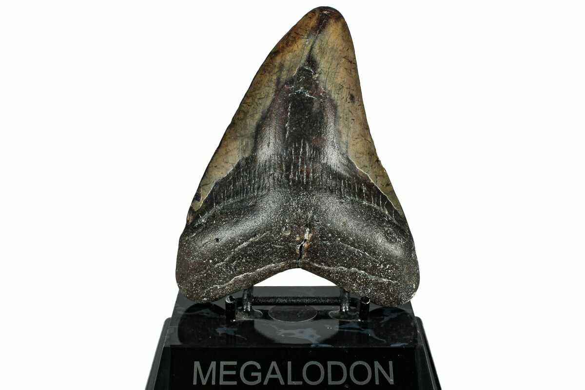 This is a large, 5.08" long megalodon tooth collected on the North Carolina coast. It was found by commercial divers collecting "the ledges" in about 100 feet of water. It would have eroded out of the Pungo River Formation putting its age in the range of 13.8 to 16 million years old. A tooth of this size would have come from a prehistoric, mega-shark in the 40 foot size range.