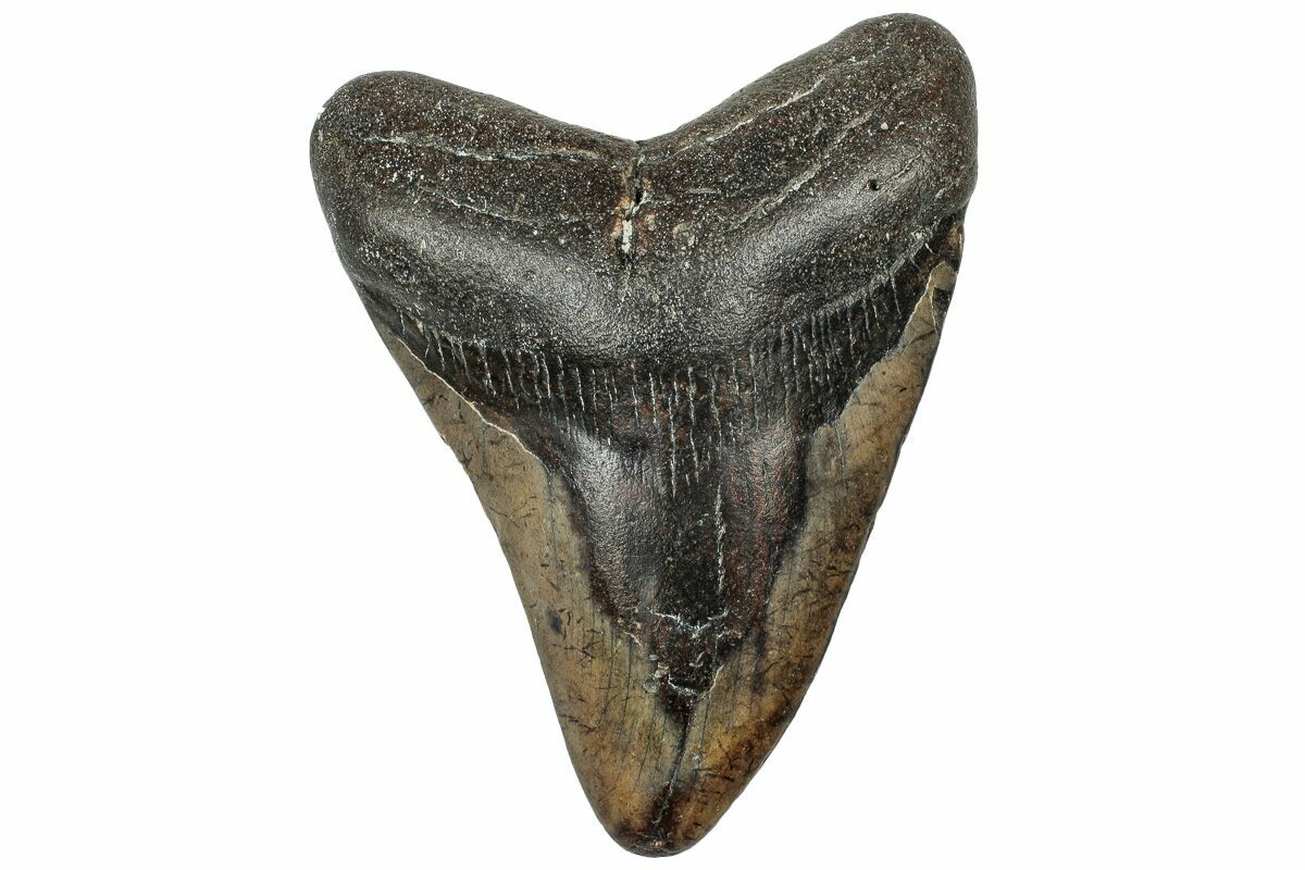 The standard measure for megalodon teeth is slant height, or the longest edge of the tooth. Adult megalodon teeth were typically in the 4 to 5 inch range: teeth over 6 inches are rare and represent super-sized individuals. Only a handful of teeth have ever been found over seven inches.