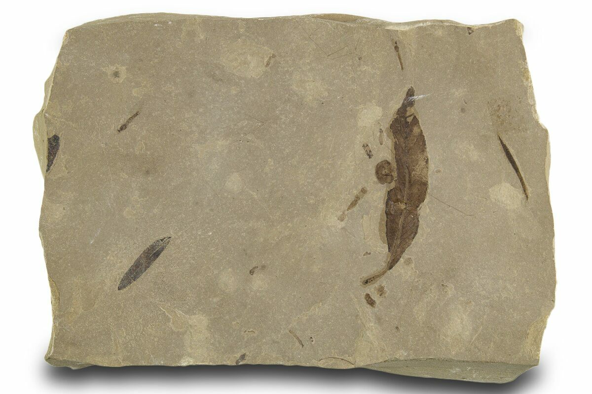 This is an amazing, 5.1" wide piece of shale that contains two fossil leaves (Mimosites coloradensis & Cedrelospermum nervosum), crane flies (family Tipulidae, and a fly (order Diptera). The specimen was collected from the Green River Formation of Uintah County, Utah. While this formation is best known for well preserved fossil fish found in Wyoming, other sections of the formation contain a very diverse flora and insect fauna.
