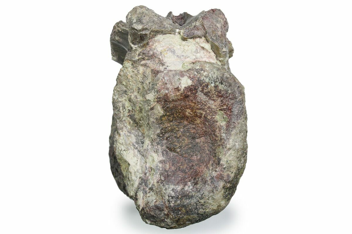 This is a 5.1" tall fossil theropod dinosaur (Allosaurus sp.) vertebra, collected from the Late Jurassic-aged Morrison Formation in Utah. It is either an anterior caudal or a posterior dorsal vertebra. Rock has been left within the neural canal to assist in structural integrity.