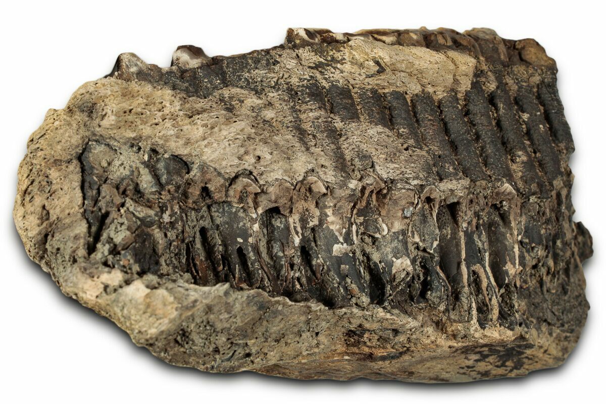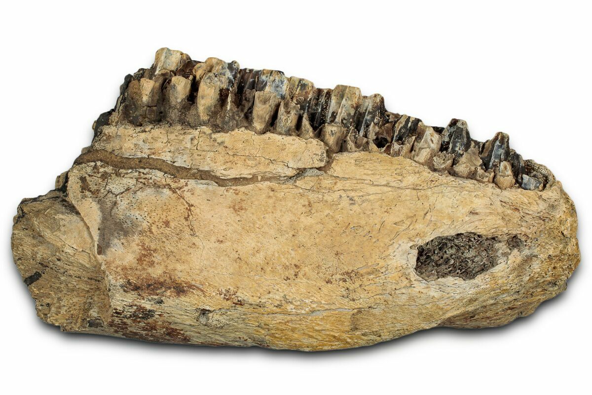 This is a 5.1" wide upper jaw section of Edmontosaurus annectens, a type of duck-billed dinosaur from the Hell Creek Formation in Montana. It features a partial battery of teeth from a sub-adult animal.