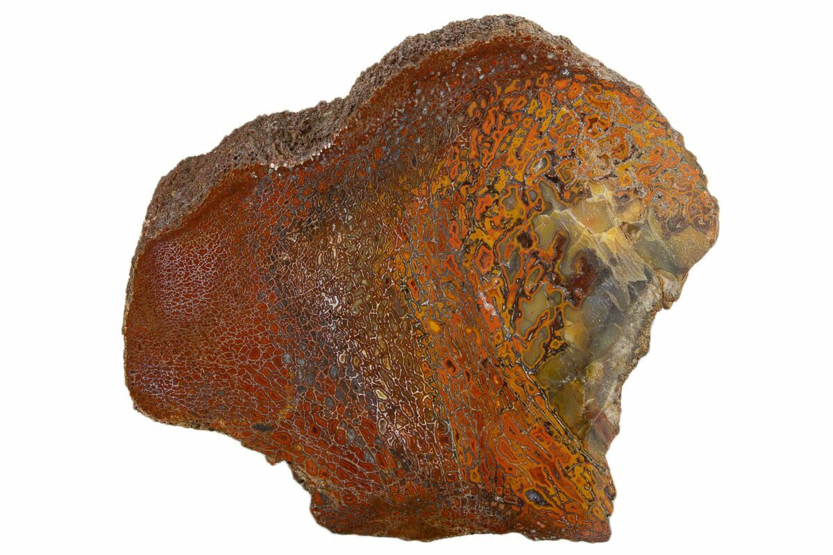This is a very vibrant, 5.1" wide slab of polished agatized dinosaur bone (gembone) from the Morrison Formation in New Mexico. It is polished to a glossy finish on one side while the opposite side is rough.