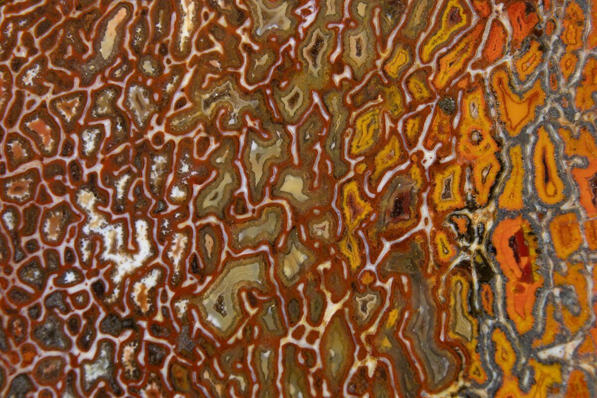 Dinosaur gembone (agatized dinosaur bone) forms when the porous structure of dinosaur bone is replaced by silica-rich minerals like agate, chalcedony, or jasper. This preserves the bone’s internal cell patterns, creating striking, web-like textures visible when polished.