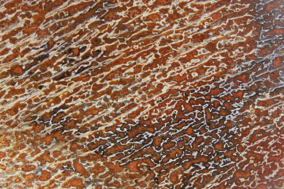 Dinosaur gembone (agatized dinosaur bone) forms when the porous structure of dinosaur bone is replaced by silica-rich minerals like agate, chalcedony, or jasper. This preserves the bone’s internal cell patterns, creating striking, web-like textures visible when polished.