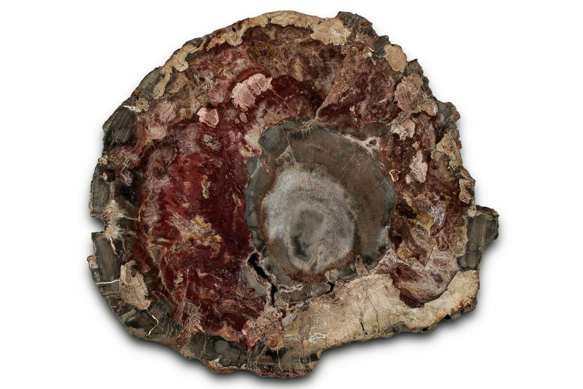 Madagascar petrified wood comes primarily from extensive Triassic-aged deposits in the Mahajanga Basin of northwestern Madagascar, where ancient conifer forests—often attributed to species related to Araucarioxylon—were buried by volcanic ash and floodplain sediments roughly 225–240 million years ago. Over immense spans of time, silica-rich fluids percolated through these sediments, replacing the cellular structure of the wood with chalcedony, jasper, agate, and quartz while preserving growth rings, bark textures, and even microscopic details. The region’s unique geochemistry—especially its iron, manganese, and occasionally copper content—produces the vivid palette Madagascar petrified wood is famous for, including deep brick reds, golden yellows, smoky blacks, and pastel pinks. Many logs are found fully silicified and naturally fractured into large, rounded segments that local artisans cut into slabs, spheres, eggs, and freeforms. These deposits stretch across arid badlands where erosion steadily exposes new material, making Madagascar one of the world’s premier sources of highly colorful, beautifully patterned fossil wood.