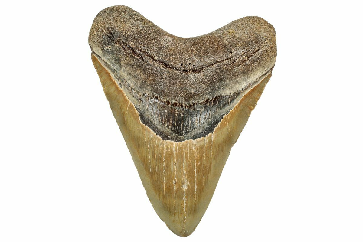 This is a large 5.10" long megalodon tooth collected on the North Carolina coast. It was found by commercial divers collecting "the ledges" in about 100 feet of water. It would have eroded out of the Pungo River Formation putting its age in the range of 13.8 to 16 million years old. A tooth of this size would have come from a prehistoric mega-shark in the 40 foot size range.