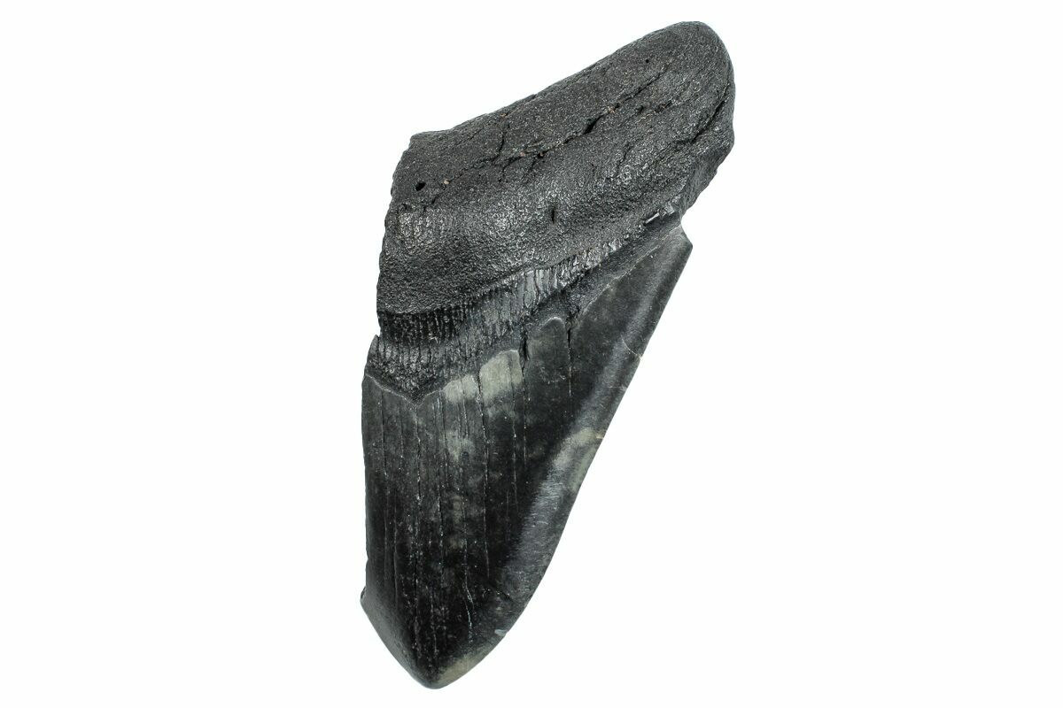 The standard measure for megalodon teeth is slant height, or the longest edge of the tooth. Adult megalodon teeth were typically in the 4 to 5 inch range: teeth over 6 inches are rare and represent super-sized individuals. Only a handful of teeth have ever been found over seven inches.