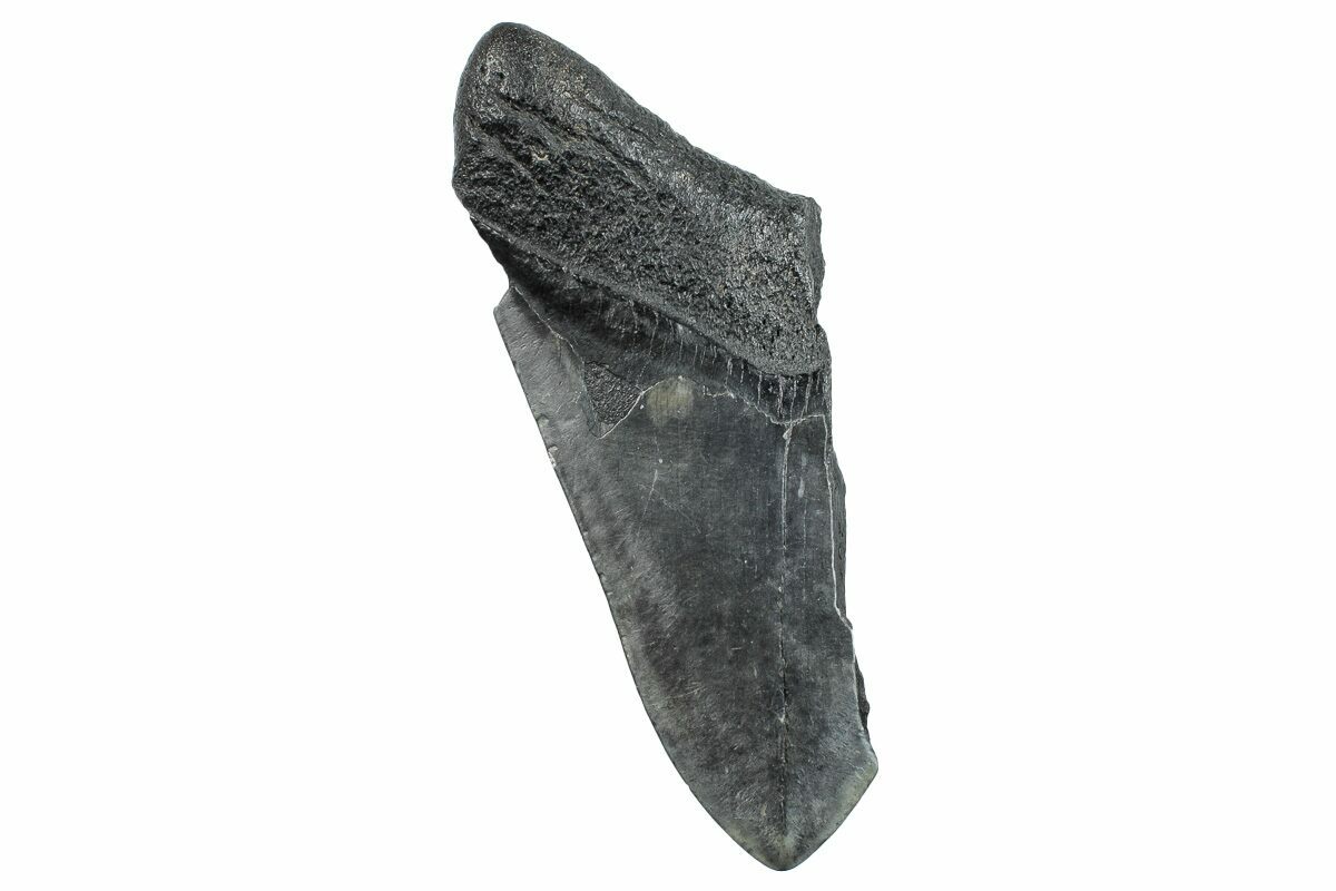This is a half of a fossil megalodon tooth collected from the Hawthorn Formation in South Carolina. Very often teeth are found broken down the middle and are much more common than finding complete unbroken teeth. Given the size of this tooth, it would have come from a prehistoric, mega-shark in the 40+ foot size range.