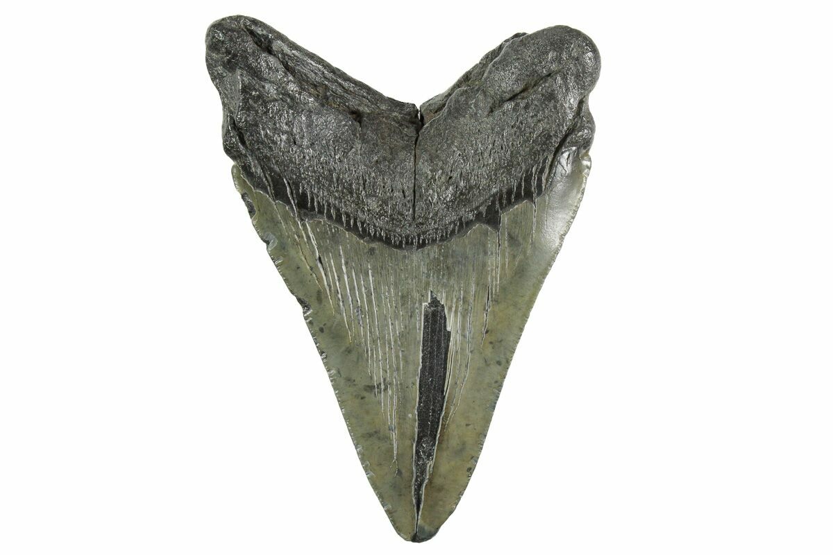 The standard measure for megalodon teeth is slant height, or the longest edge of the tooth. Adult megalodon teeth were typically in the 4 to 5 inch range: teeth over 6 inches are rare and represent super-sized individuals. Only a handful of teeth have ever been found over seven inches.