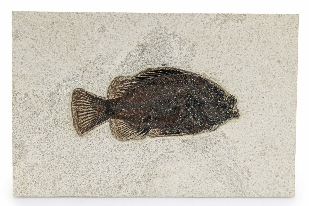Specimens like this come from the coveted 18 inch layer of the Green River Formation, which produces darker and more detailed fish than the majority on the market. The rock from this layer is much harder and more durable than other layers in the formation, likely due to its initial deposition conditions in deep water. Because of these conditions, fish found in the 18-inch layer can be extracted whole and in excellent condition. This layer is typically collected at night using low-angle light to see the bump in the rock that the fish's backbone creates. They then cut these fish out and take them to a lab where the fish, which may be up to an inch under the surface of the rock, are meticulously extracted under microscope with hand tools.