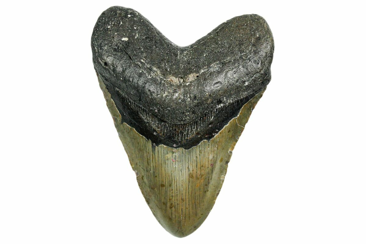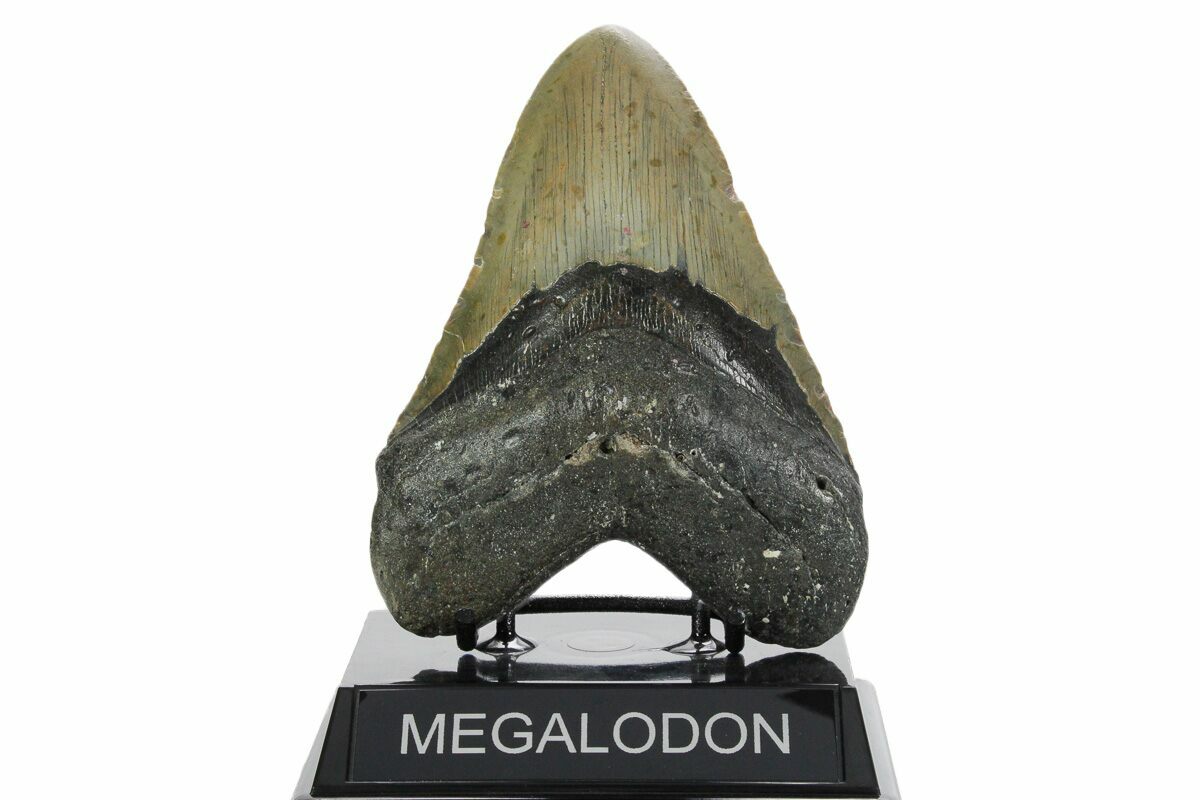 This is a large, 5.15" long megalodon tooth collected on the North Carolina coast. It was found by commercial divers collecting "the ledges" in about 100 feet of water. It would have eroded out of the Pungo River Formation putting its age in the range of 13.8 to 16 million years old. A tooth of this size would have come from a prehistoric mega-shark in the 40 foot size range.