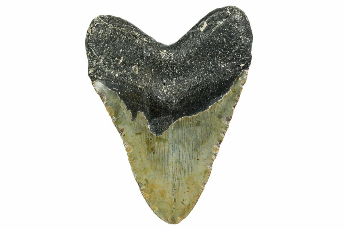 The standard measure for megalodon teeth is slant height, or the longest edge of the tooth. Adult megalodon teeth were typically in the 4 to 5 inch range: teeth over 6 inches are rare and represent super-sized individuals. Only a handful of teeth have ever been found over seven inches.