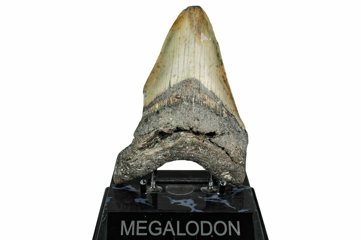 The standard measure for megalodon teeth is slant height, or the longest edge of the tooth. Adult megalodon teeth were typically in the 4 to 5 inch range: teeth over 6 inches are rare and represent super-sized individuals. Only a handful of teeth have ever been found over seven inches.