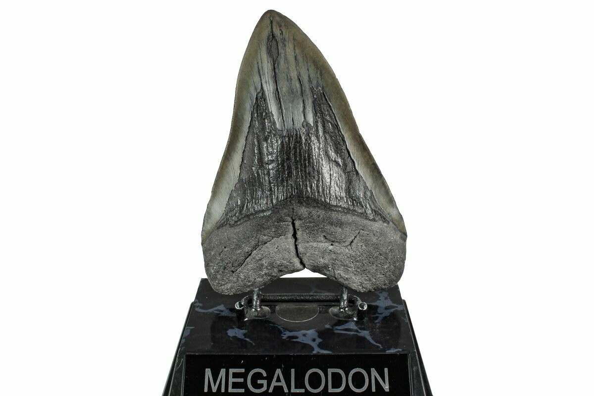 This is a large, 5.17" fossil Megalodon tooth collected in South Carolina, representing a prehistoric mega-shark that would have exceeded 40 feet in length.