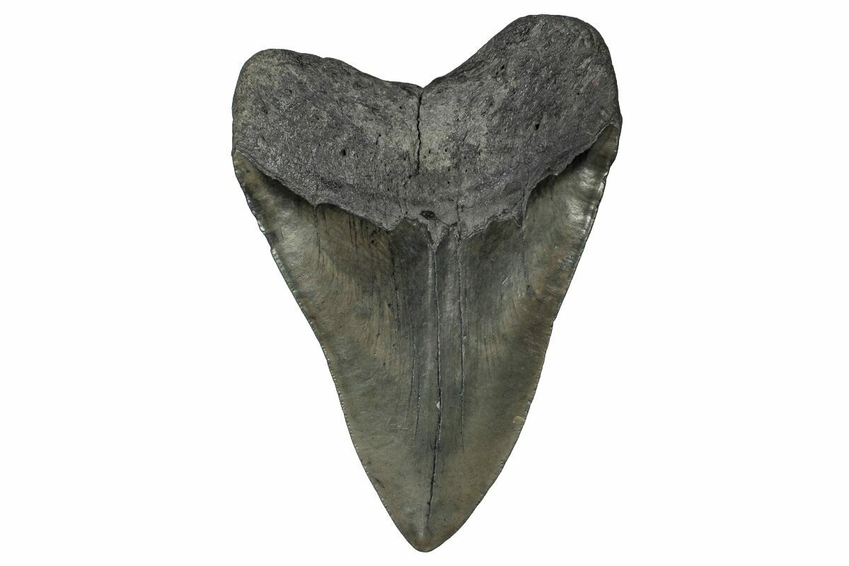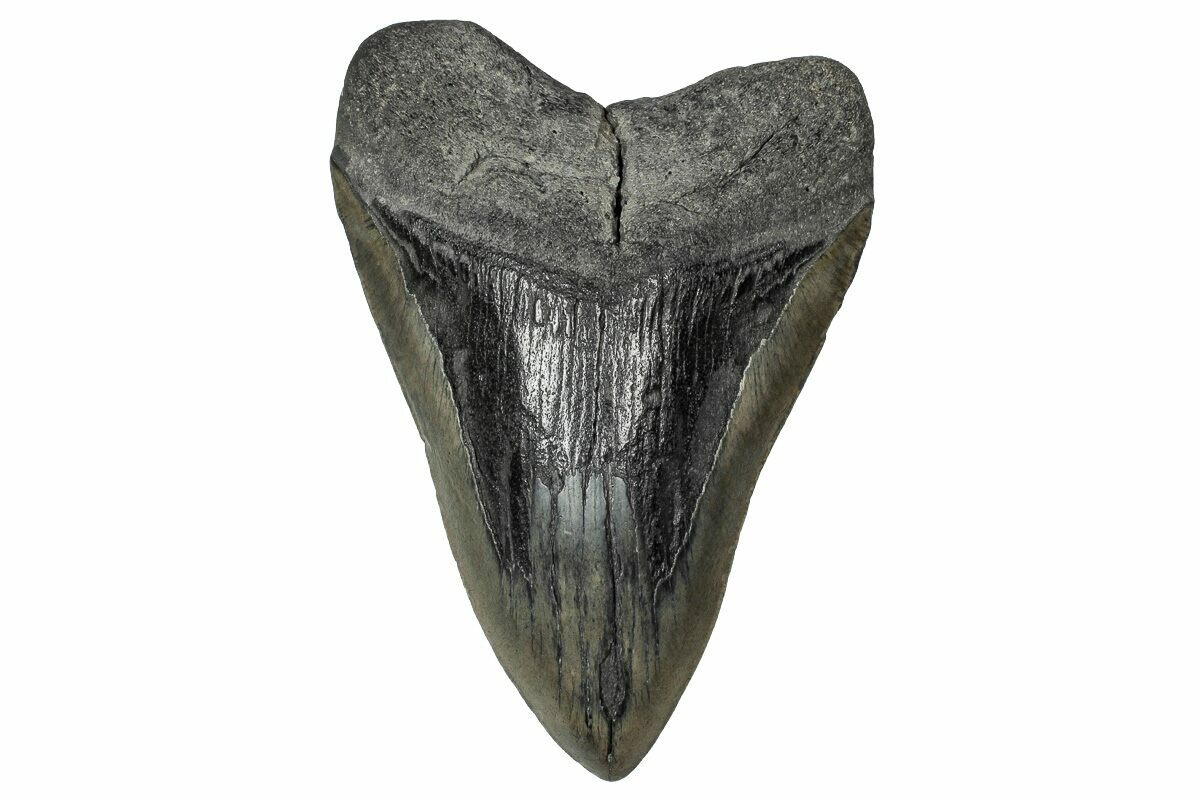 The standard measure for megalodon teeth is slant height, or the longest edge of the tooth. Adult megalodon teeth were typically in the 4 to 5 inch range: teeth over 6 inches are rare and represent super-sized individuals. Only a handful of teeth have ever been found over seven inches.