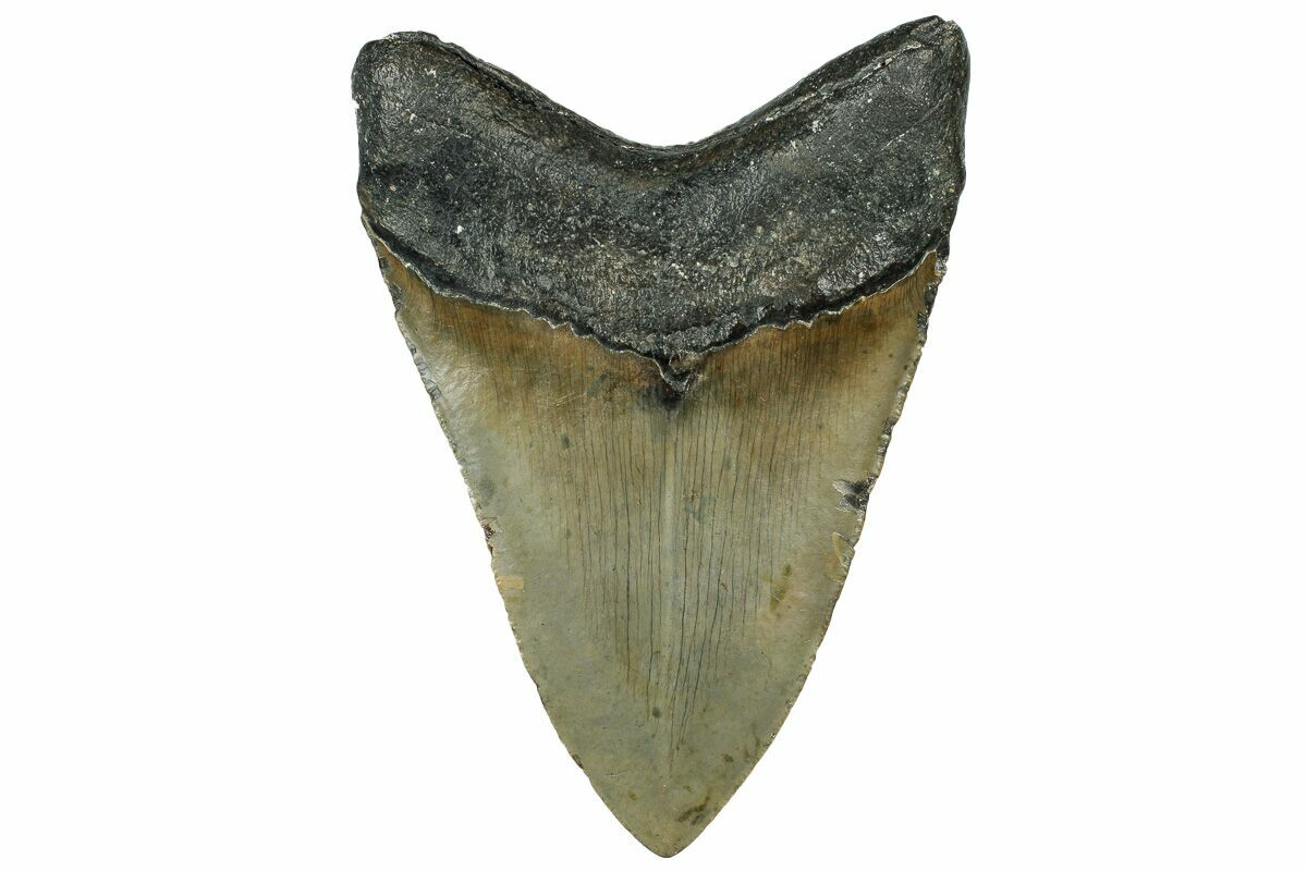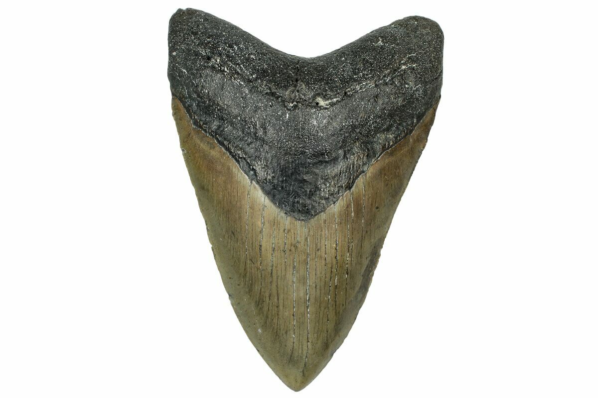 The standard measure for megalodon teeth is slant height, or the longest edge of the tooth. Adult megalodon teeth were typically in the 4 to 5 inch range: teeth over 6 inches are rare and represent super-sized individuals. Only a handful of teeth have ever been found over seven inches.