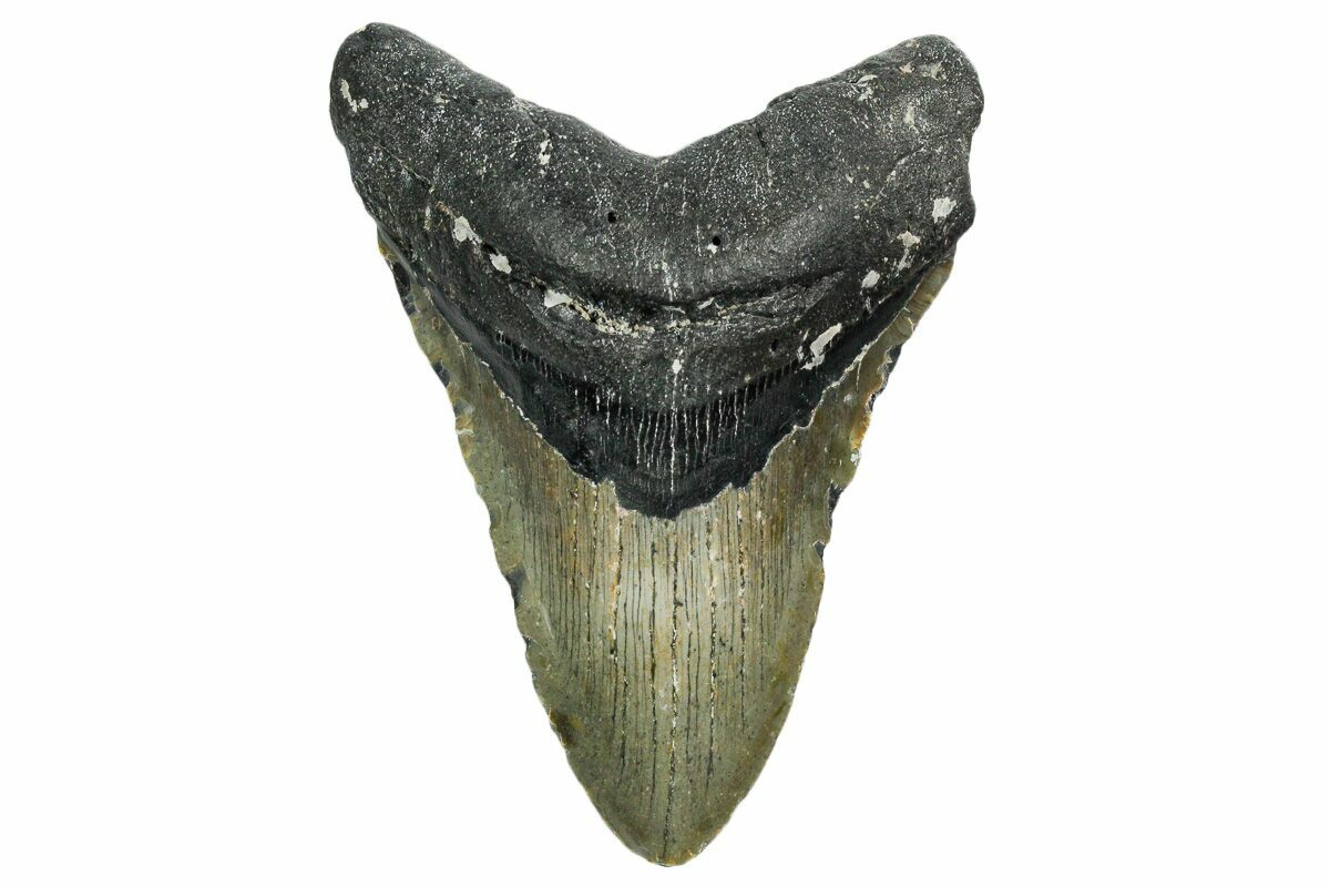 The standard measure for megalodon teeth is slant height, or the longest edge of the tooth. Adult megalodon teeth were typically in the 4 to 5 inch range: teeth over 6 inches are rare and represent super-sized individuals. Only a handful of teeth have ever been found over seven inches.