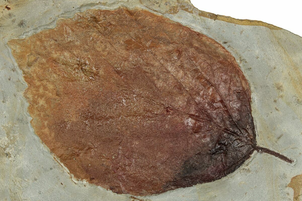 These leaves are typically preserved as colorful carbon films or fine impressions in soft, tan to gray mudstones and siltstones laid down on ancient floodplains, river margins, ponds, and swamps. Many specimens show crisp vein networks and margins (smooth or toothed), and some even retain delicate features like petioles (leaf stems) and subtle surface texture. Because they come from quiet-water sediments, the leaves are often flattened and beautifully detailed, making them ideal for display and for studying ancient plant diversity.