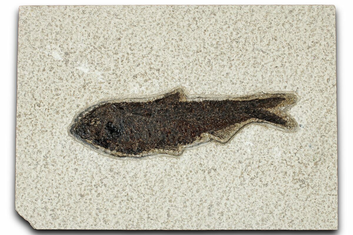 This is a nicely preserved 5.2" long fossil fish (Knightia eocaena) from the Eocene-aged Green River Formation in Wyoming. It comes out of the 18 inch layer which produces beautifully preserved fish, but takes 2-3x longer to prep. It is well-detailed and prepared with bone structure, fins, and scale structure visible. The fish is nicely centered on a rectangular cut slab of rock