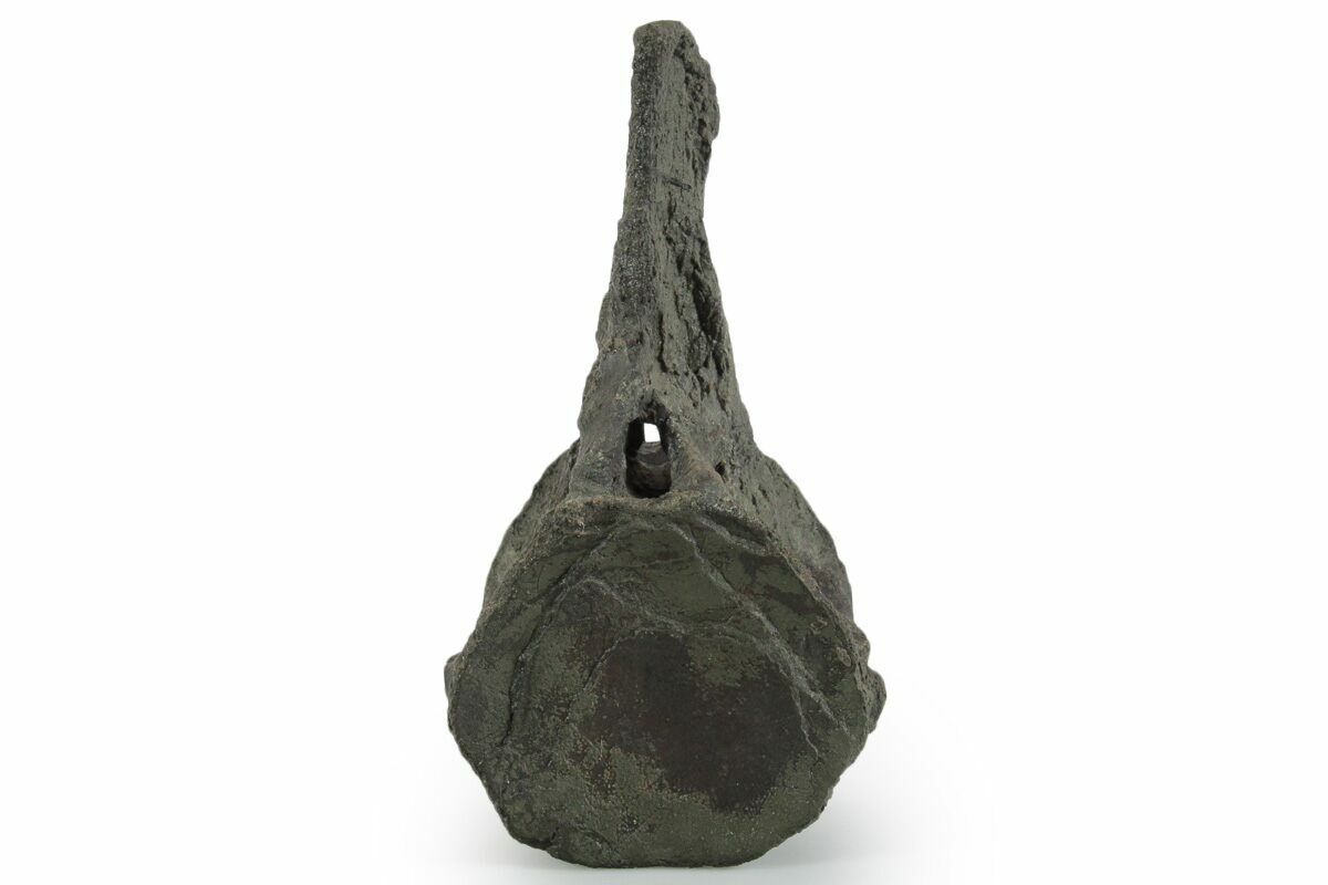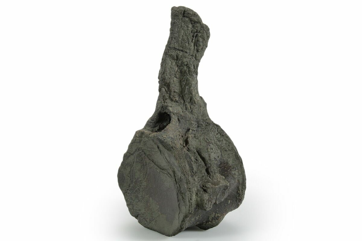 This is a 5.2" tall vertebra from a mosasaur (Clidastes sp.?) collected from the Upper Cretaceous-aged Ozan Formation in Fannin County, Texas. The bone preservation on this specimen is very nice and the detail is exquisite. There is a repaired crack through the neural canal and another through the spinous process.