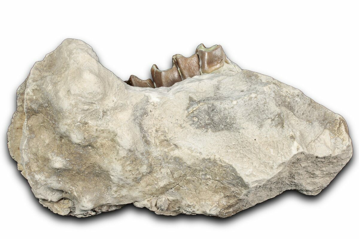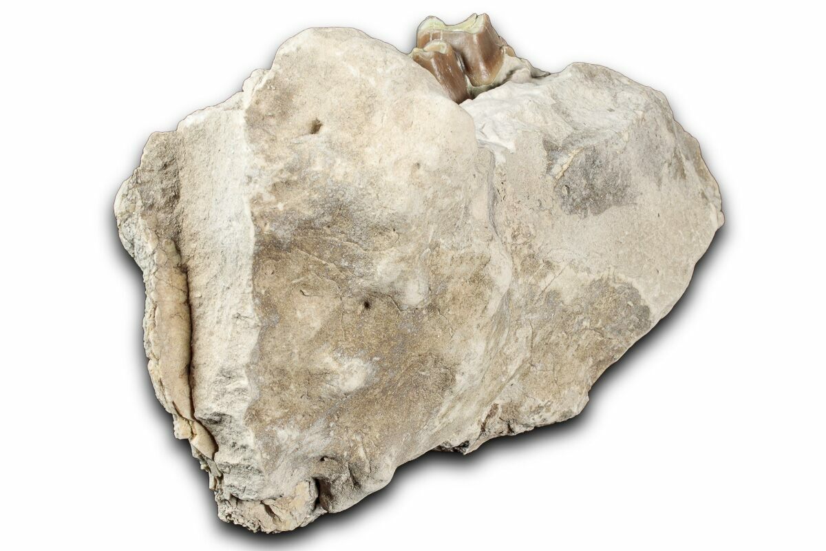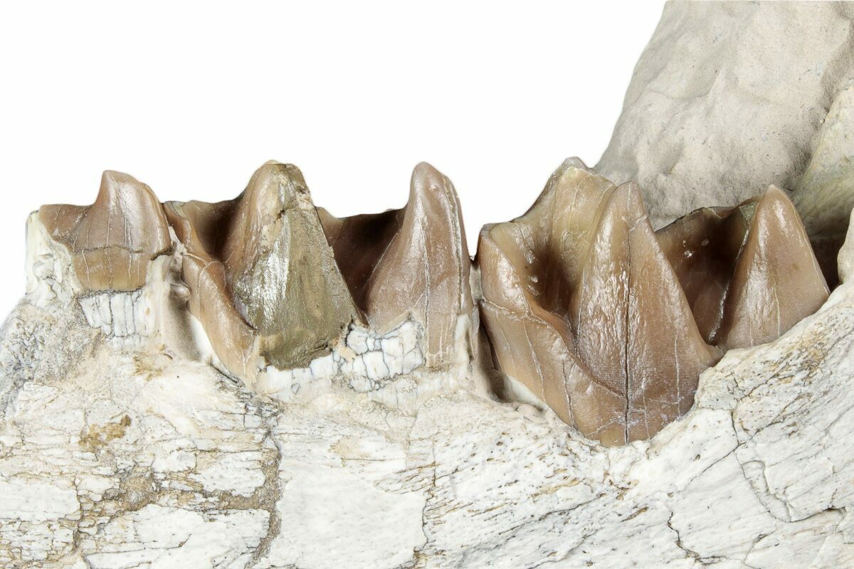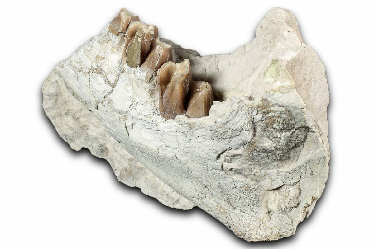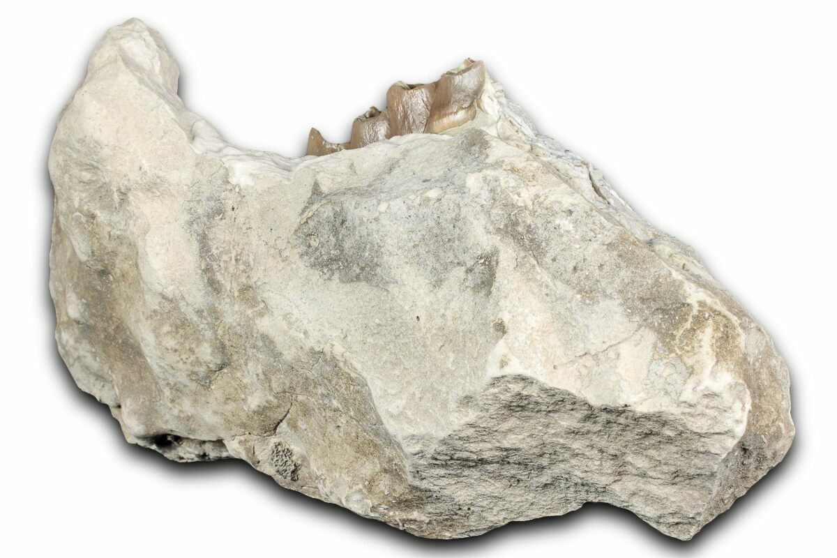 This is a 5.2" wide mandible (left side) section from a sub-adult running rhino (Hyracodon nebraskensis). It was collected from the the Brule Formation in South Dakota and would be approximately 30-33 million years old. There are two complete preserved teeth still embedded in the jaw and a section of rock is still attached to the bone.