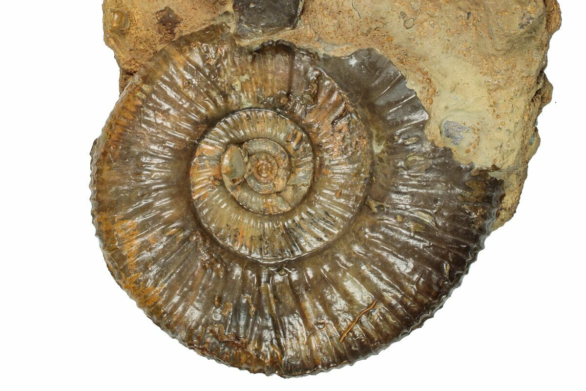 This is a beautiful, 5.2" wide Parkinsonia ammonite fossil pair from the Parkinsonien-Oolith within the Berching Subformation (Sengenthal Formation) of Germany. These Jurassic-age ammonites have been carefully exposed from the rock, with a section of rock still attached, acting as a base for aesthetic presentation.