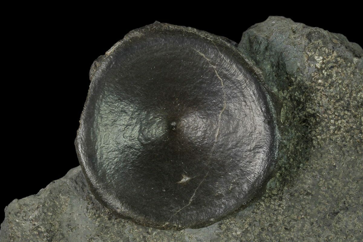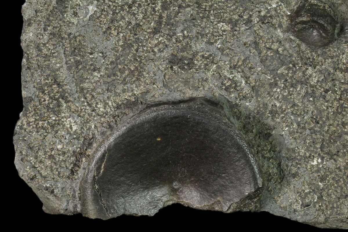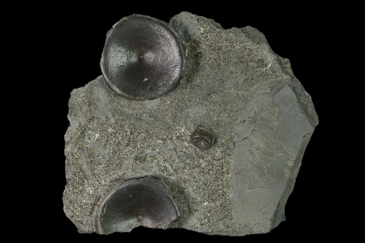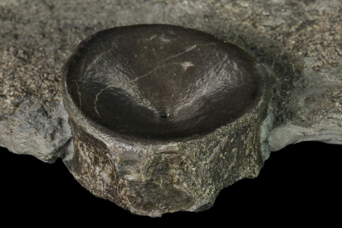 This is a 5.2" wide plate of Ichthyosaur vertebrae from the Posidonia Shale in Baden-Württemberg, Germany. There are two complete vertebrae and one partial in the shale. The vertebrae have been nicely prepared to bring the bone out in high relief against the shale.