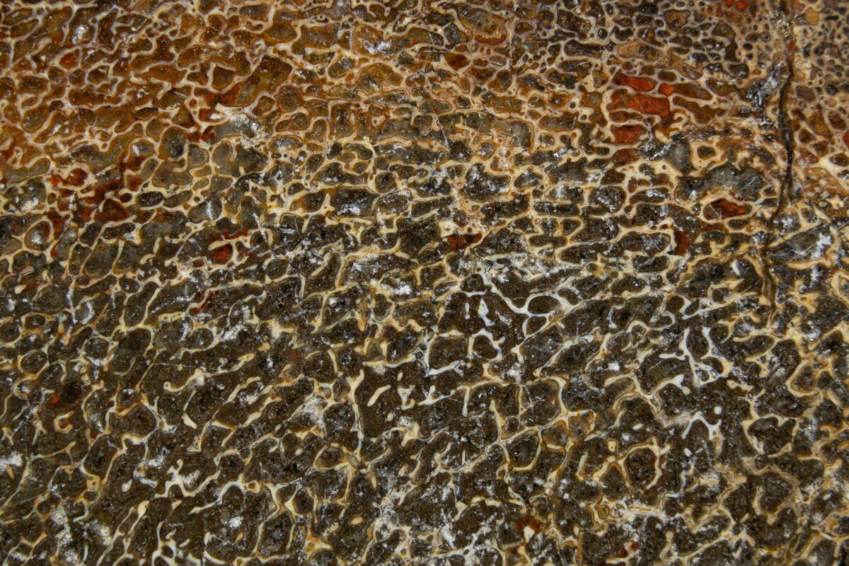 Dinosaur gembone (agatized dinosaur bone) forms when the porous structure of dinosaur bone is replaced by silica-rich minerals like agate, chalcedony, or jasper. This preserves the bone’s internal cell patterns, creating striking, web-like textures visible when polished.