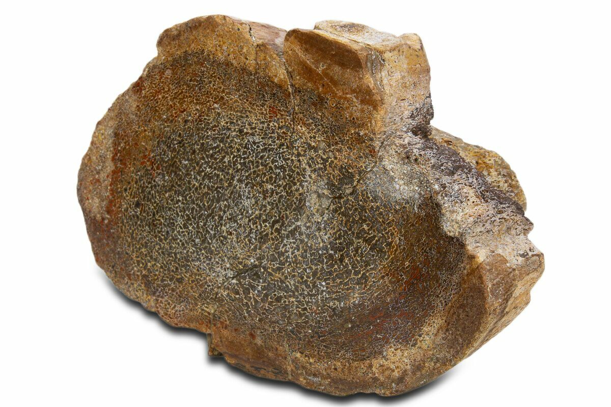 This is a dinosaur limb bone section from the Morrison Formation preserved in very vibrantly colored gembone. One side has been cut and polished to reveal the internal cell structure preserved in colorful red/brown agate. The piece measures 5.2 x 4.5 x 3.5"