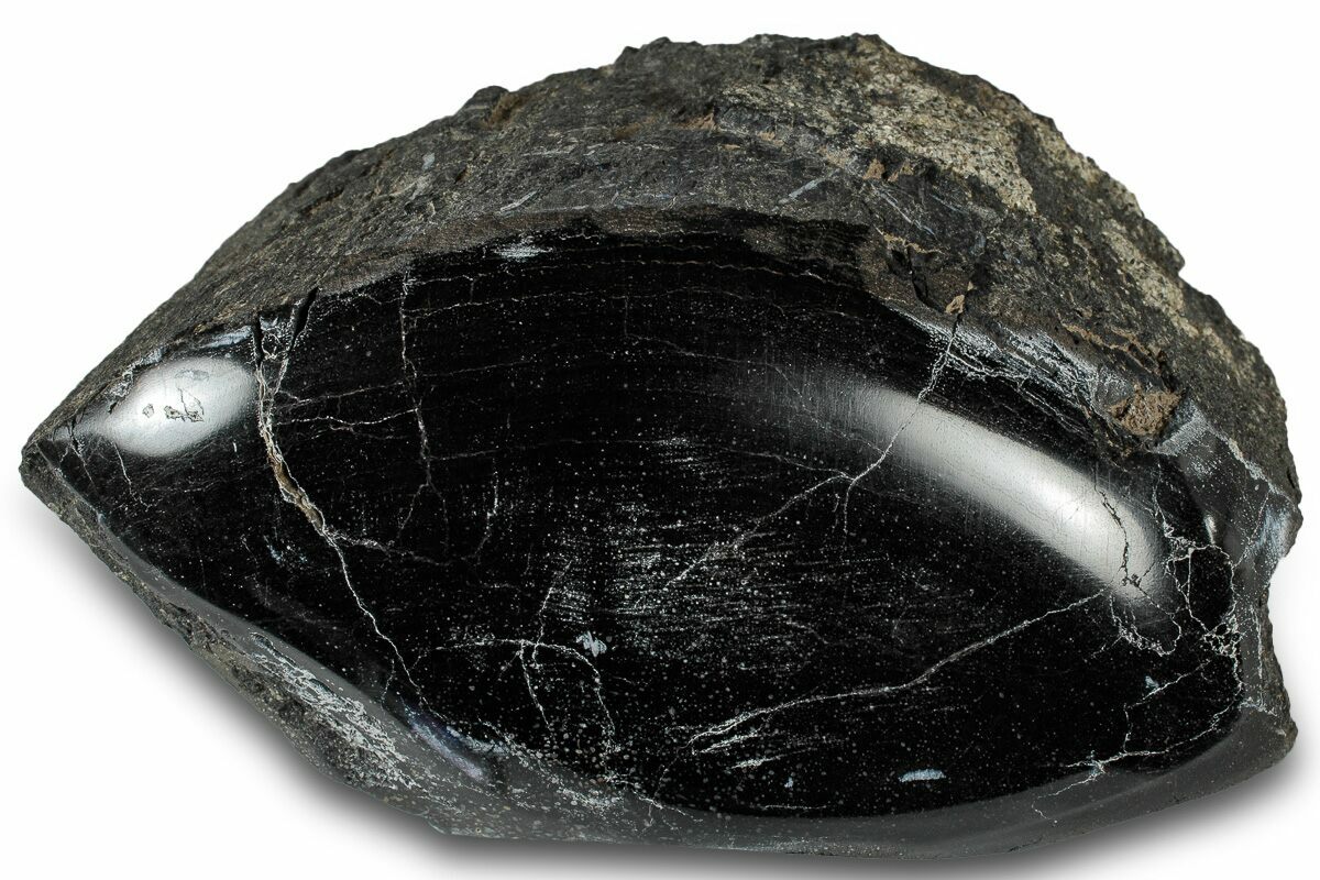 This is a 5.2" wide fossil dinosaur bone section, collected from the Late Jurassic-aged Morrison Formation at the famous Bone Cabin Quarry in Wyoming. The bone is very dense from silicification (gembone). One edge of the bone has been polished to a glossy finish to show off this silicification.