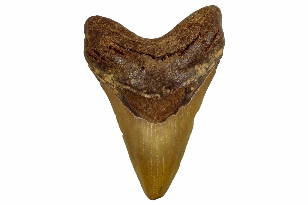 The standard measure for megalodon teeth is slant height, or the longest edge of the tooth. Adult megalodon teeth were typically in the 4 to 5 inch range: teeth over 6 inches are rare and represent super-sized individuals. Only a handful of teeth have ever been found over seven inches.