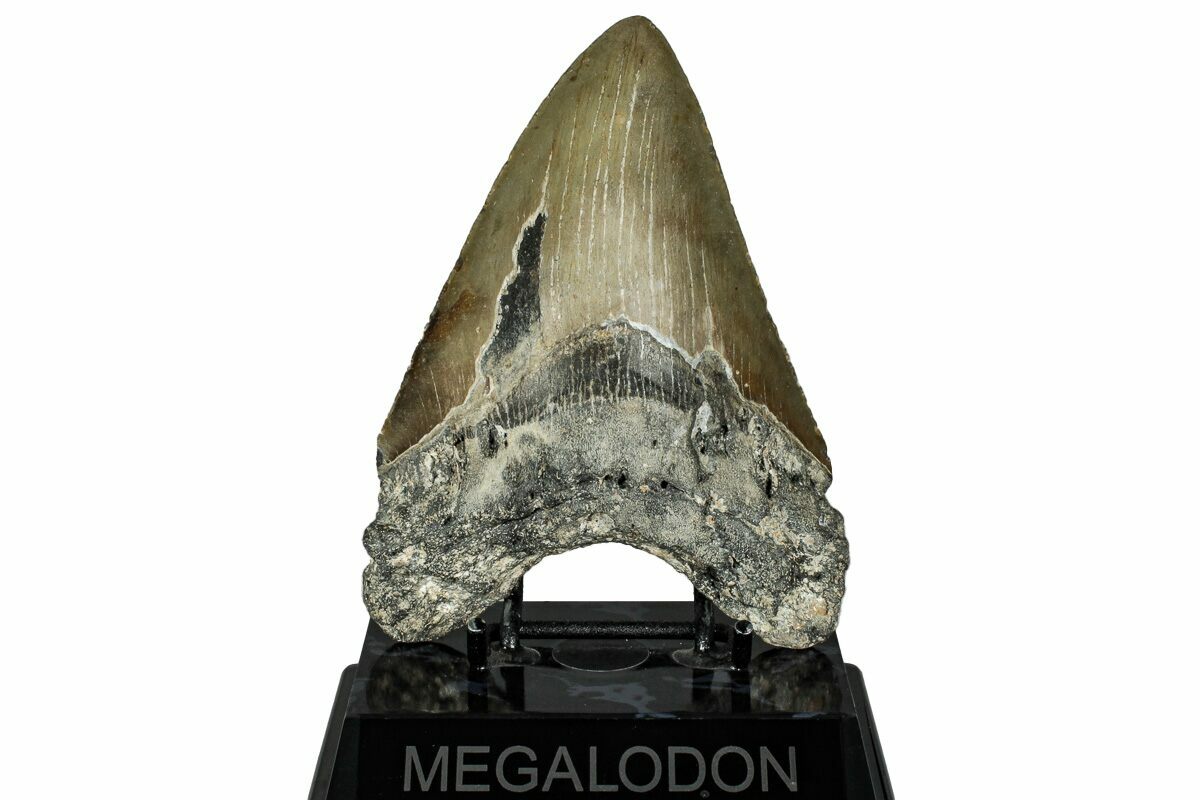 The standard measure for megalodon teeth is slant height, or the longest edge of the tooth. Adult megalodon teeth were typically in the 4 to 5 inch range: teeth over 6 inches are rare and represent super-sized individuals. Only a handful of teeth have ever been found over seven inches.
