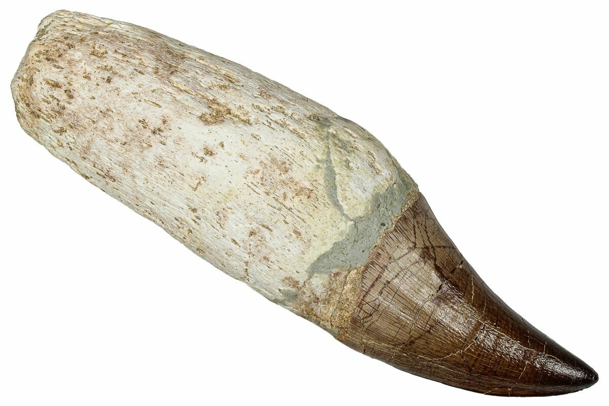 Rooted mosasaur teeth like this one are not common finds, as nearly all of the "rooted" teeth you see for sale have composite roots. The root on this one is natural, and it's well preserved. There are several repaired cracks through this tooth with gap fill in spots beneath the crown.