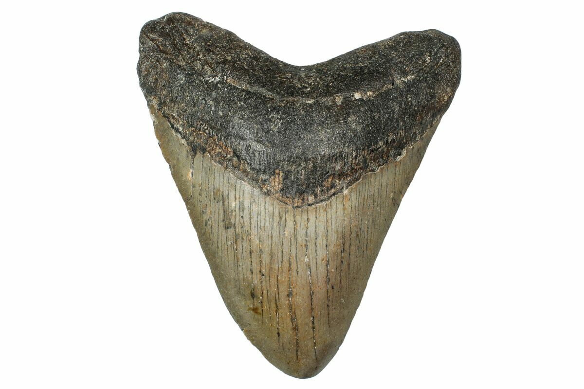 The standard measure for megalodon teeth is slant height, or the longest edge of the tooth. Adult megalodon teeth were typically in the 4 to 5 inch range: teeth over 6 inches are rare and represent super-sized individuals. Only a handful of teeth have ever been found over seven inches.