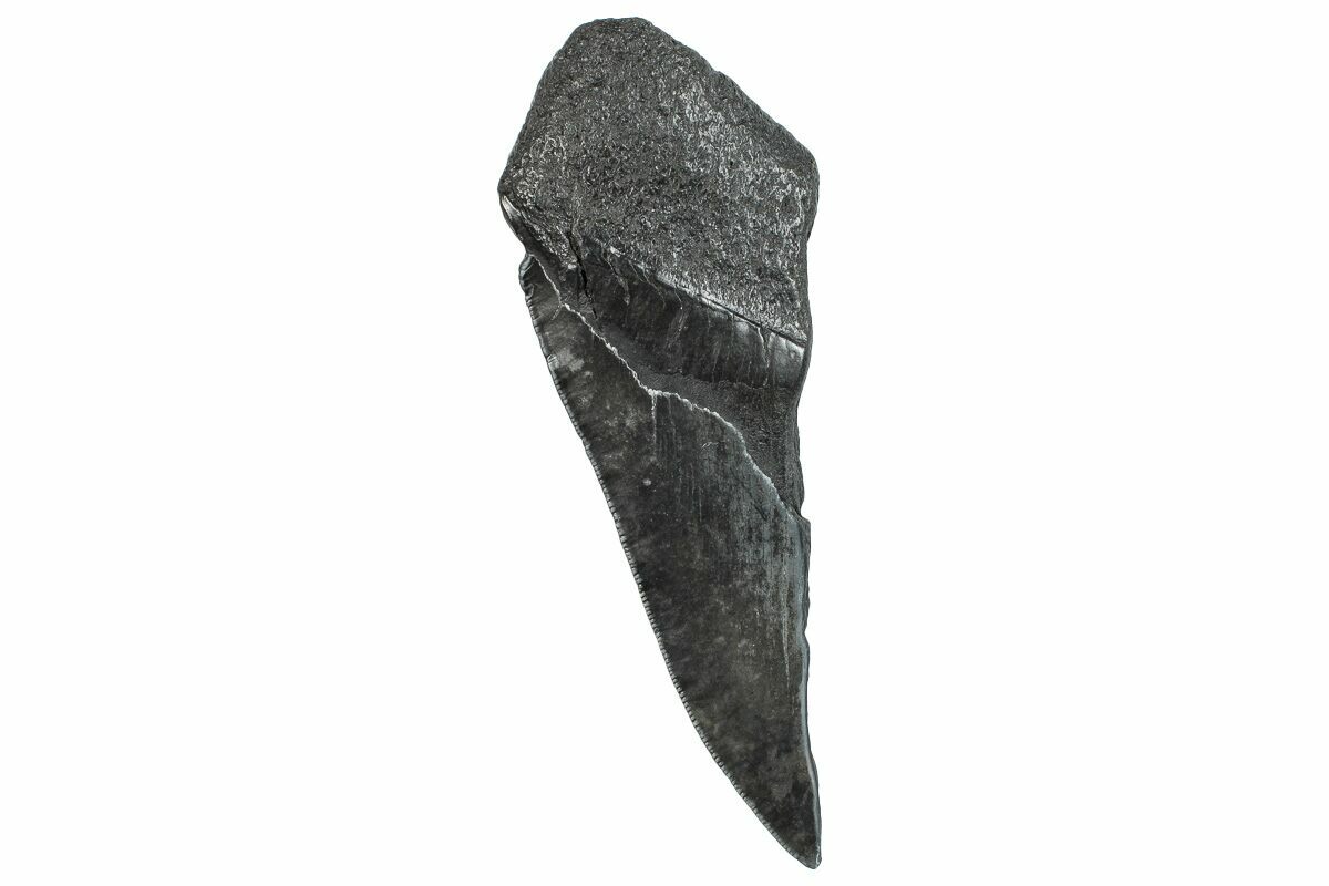 This is a half of a fossil megalodon tooth collected from the Hawthorn Formation in South Carolina. Very often teeth are found broken down the middle and are much more common than finding complete unbroken teeth. Given the size of this tooth, it would have come from a prehistoric, mega-shark in the 40+ foot size range.