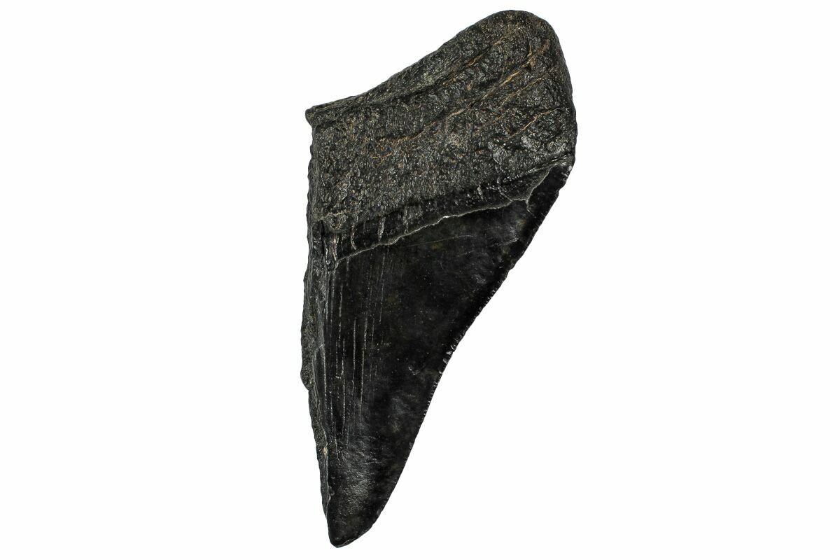 The standard measure for megalodon teeth is slant height, or the longest edge of the tooth. Adult megalodon teeth were typically in the 4 to 5 inch range: teeth over 6 inches are rare and represent super-sized individuals. Only a handful of teeth have ever been found over seven inches.