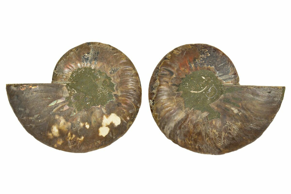 Both halves are included along with a pair of display stands. The center of the ammonite is a composite from another specimen.