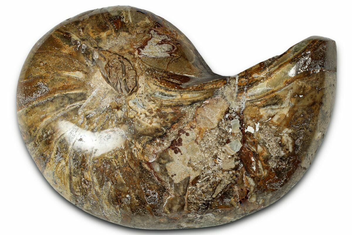 autilus is a classic shelled cephalopod with a fossil history spanning more than 500 million years. Fossil nautilus shells are instantly recognizable by their tightly coiled, chambered structure, created as the animal grew and adjusted buoyancy using a central siphuncle. These fossils often preserve beautiful suture patterns, internal chambers, and sometimes even traces of original nacre. Found in marine deposits worldwide and frequently mineralized with calcite or chalcedony, fossil Nautilus specimens provide a striking glimpse into ancient seas and showcase one of the most enduring designs in natural history.