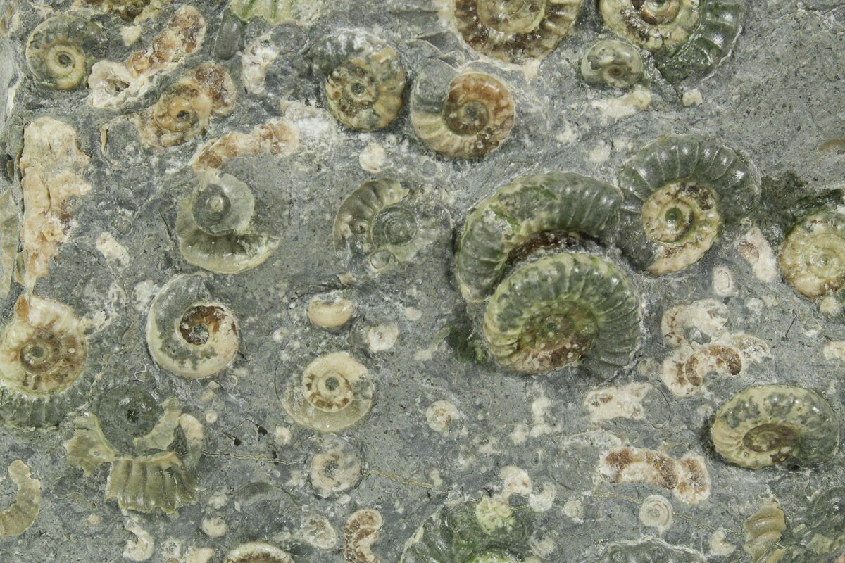 This is a 5.3" wide stone containing many small ammonite fossils. The ammonites are of the species Promicroceras marstonense and are Lower Jurassic (~200 million years old) in age. This rock is quarried near Marston Magna, Somerset, England. Locally this ammonite filled rock is known as "Marston Marble".