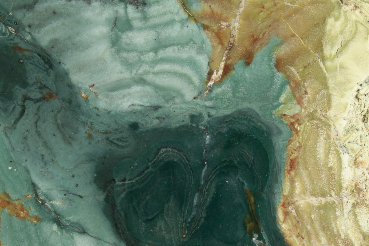 This is a 5.3" wide slab of jasper replaced petrified wood that was collected near McDermitt, Oregon. This specimen has been polished to a glossy finish on one side for aesthetic presentation. It has absolutely stunning blue and green coloration.