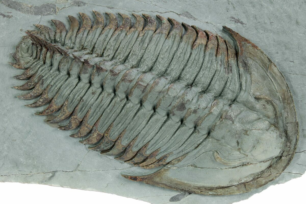This is an impressive, 5.3" long example of Longianda termieri (Neltner & Poctey, 1950) from the Issafen Formation of Morocco. It has been beautifully prepared in high relief against the surrounding shale and the natural, rust colored highlights around the edges adds to the aesthetics of the piece. There is about 2% restoration on this specimen along repaired cracks.