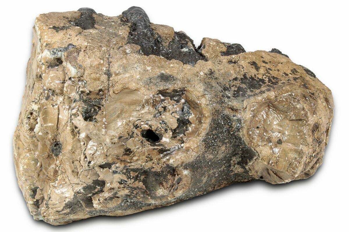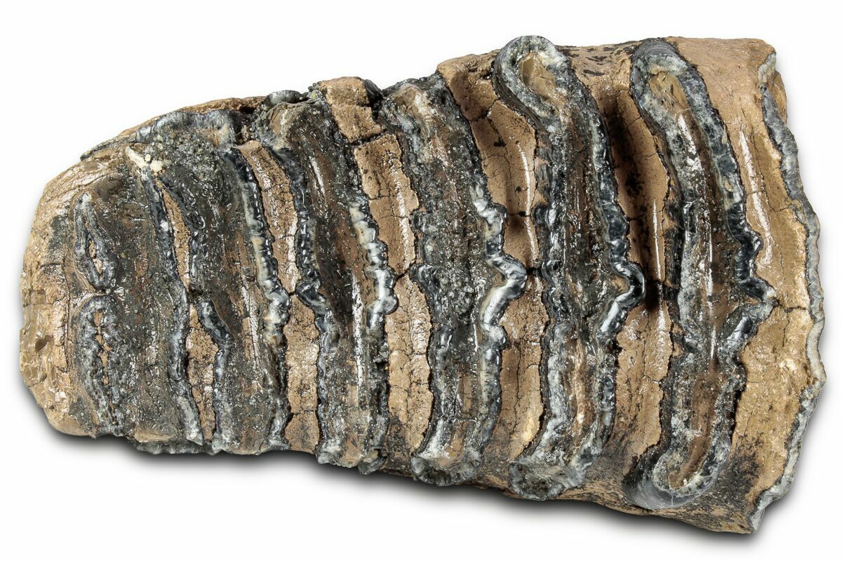 This is a 5.3" section of a Southern Mammoth (Mammuthus meridionalis) molar from Hungary. It was collected during a sand extraction/dredging operation. It is Pleistocene in age, or between approximately eight hundred thousand and one million years old. This tooth shows six prism (enamel surfaces) plates.