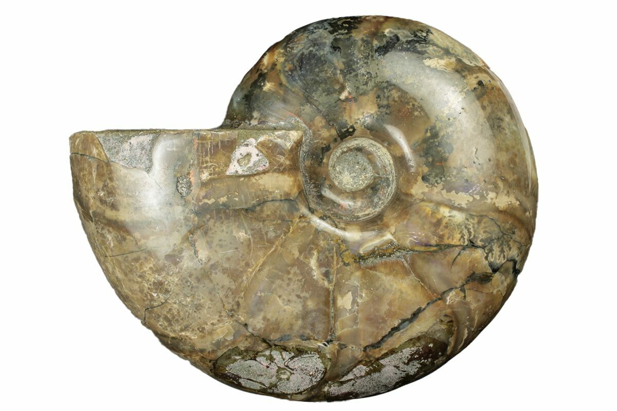 This is a beautiful, 5.3" wide polished ammonite fossil with spots of iridescent shell preservation, collected from the Mahajanga Province of Madagascar. It is Early Cretaceous (Albian Stage) in age, or approximately 110 million years old. This is one of the more uncommon ammonite species found in the area.
