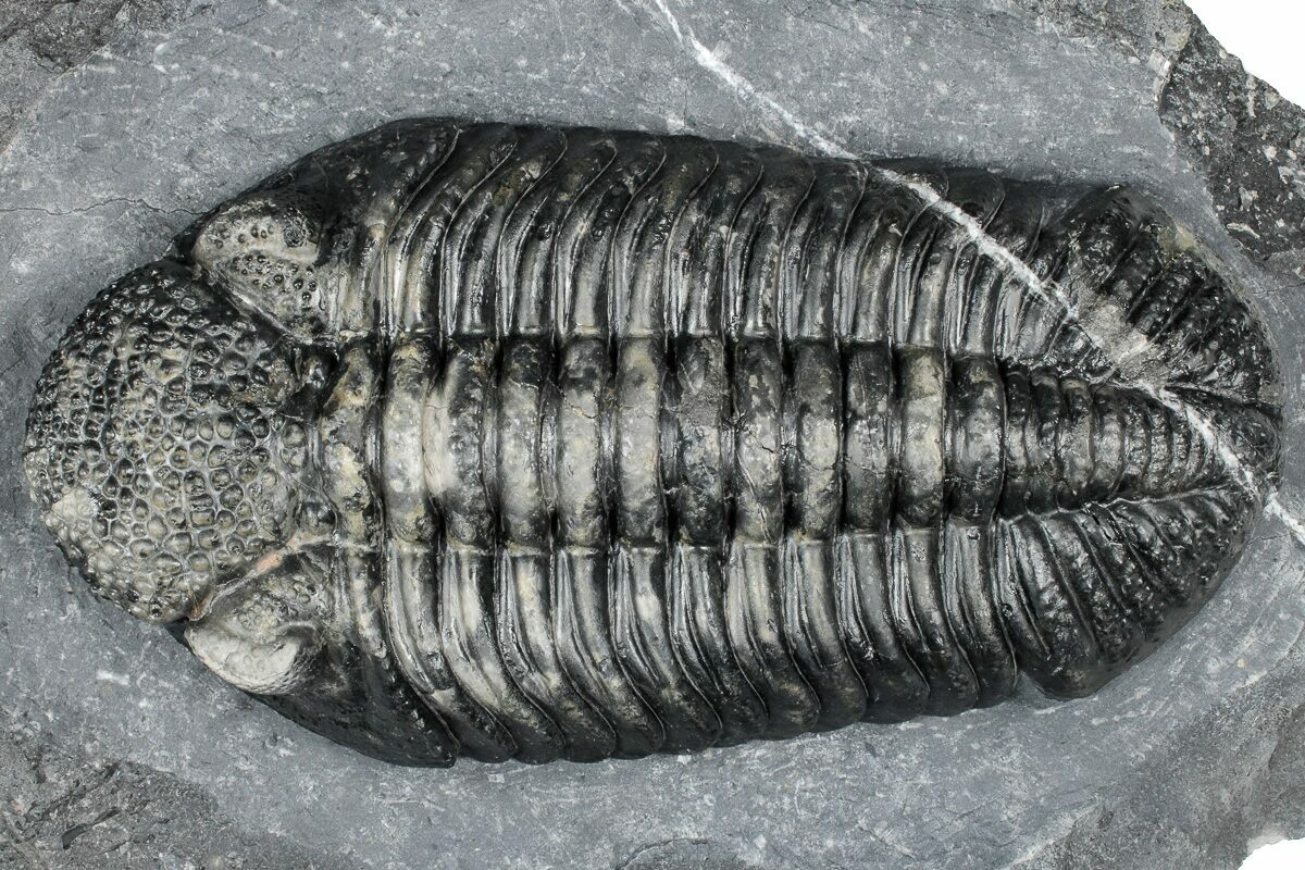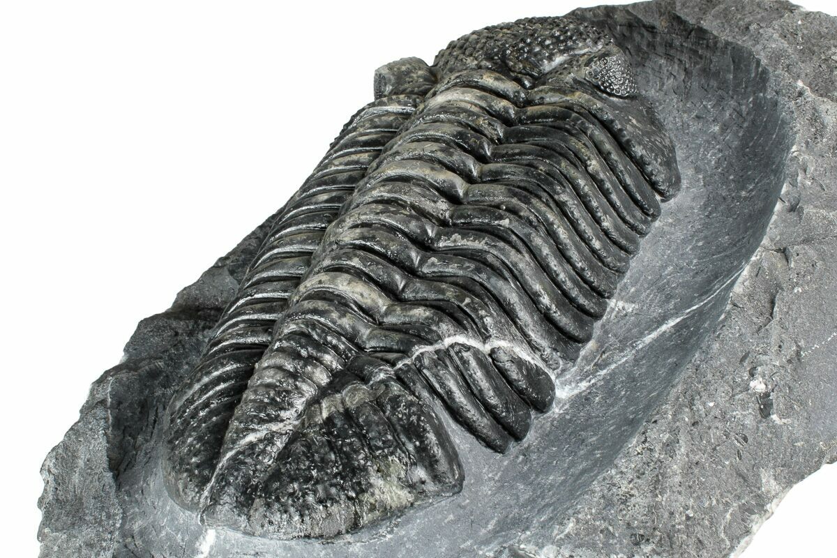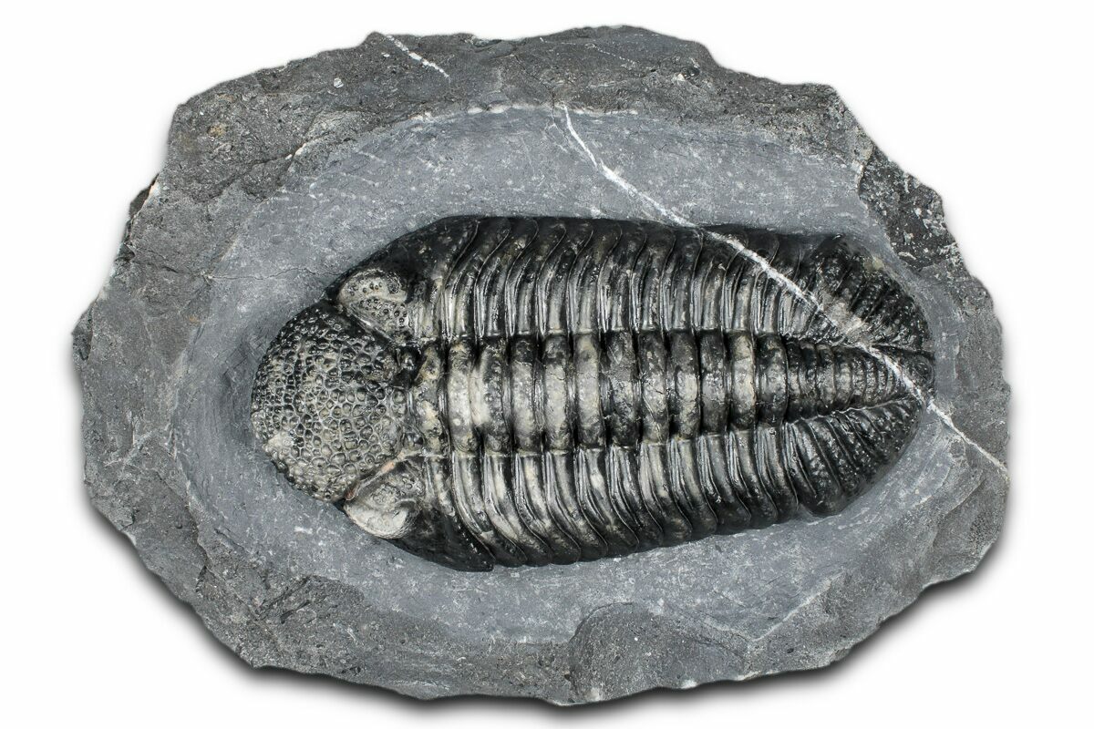 Drotops is a genus of large Phacopid trilobite found in Morocco. The genus includes two species: Drotops megalomanicus, known for its smoother exoskeleton, and Drotops armatus, distinguished by its spiny armor. Renowned for their impressive size, these trilobites can reach lengths of up to seven inches, with most specimens ranging between four and five inches.