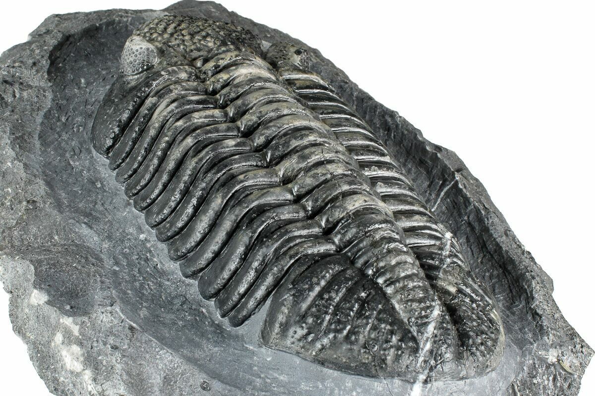 This is a large, 5.3" long Drotops megalomanicus trilobite quarried from Mrakib, Morocco. It's very 3D with excellent eye facet preservation and preparation. It is laid out nice and prone. It has less than 2-3% shell restoration along repaired cracks.