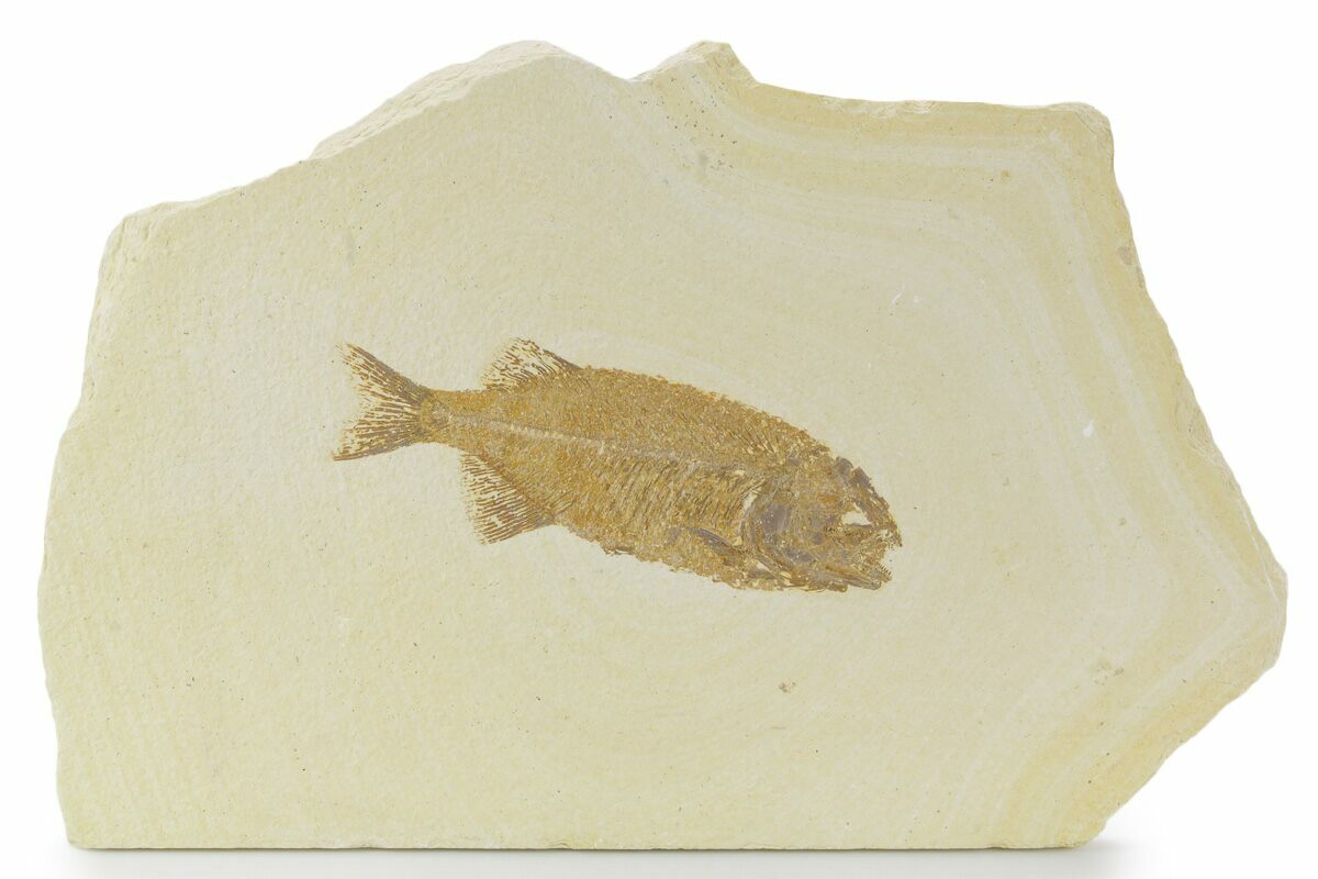 This is a 5.3" long Phareodus from our Fossil Safari Quarry on the Green River Formation of Wyoming. This predatory fish could grow to sizes close to three feet long, but this one represents a subadult. Excellent detail on this fish with a wide open mouth, full of teeth.