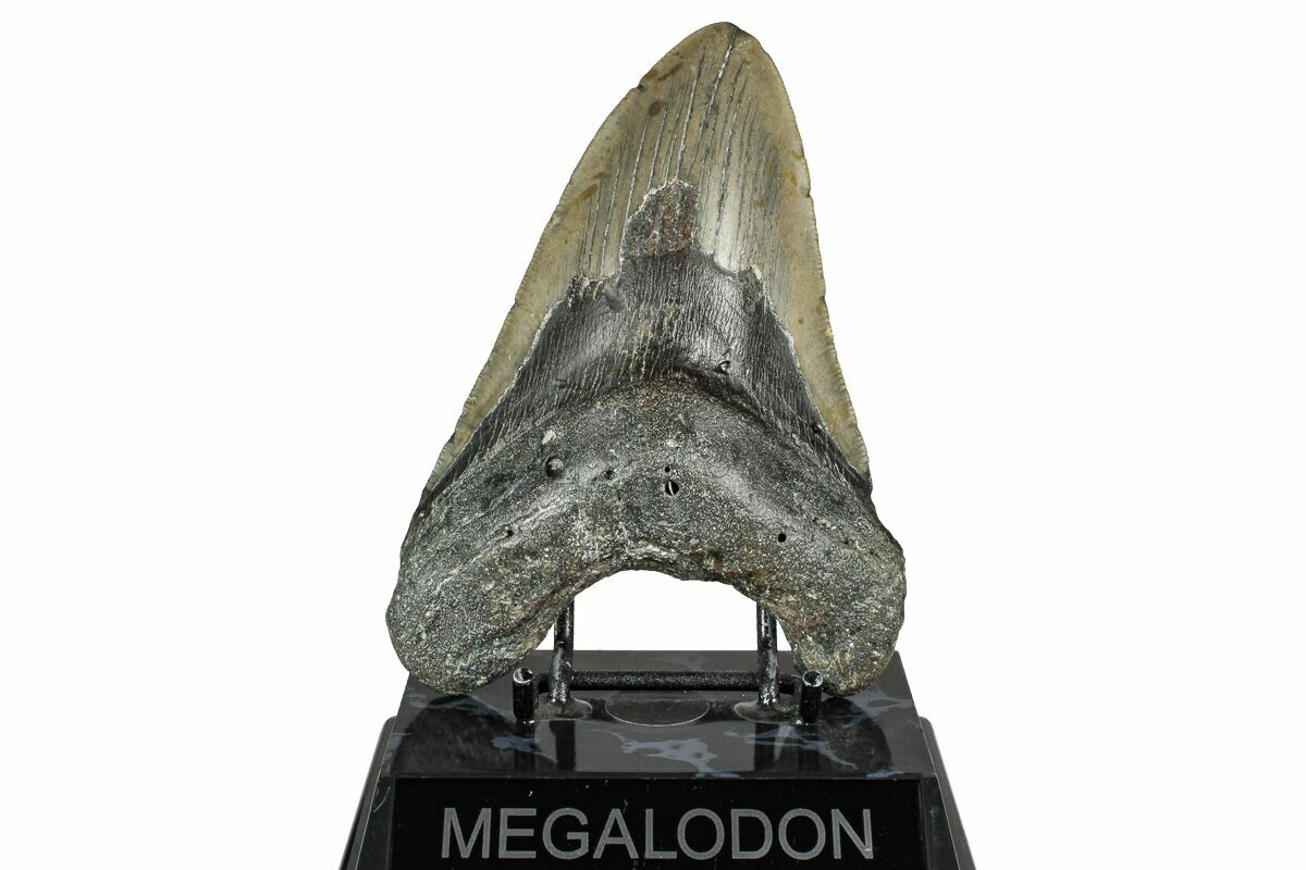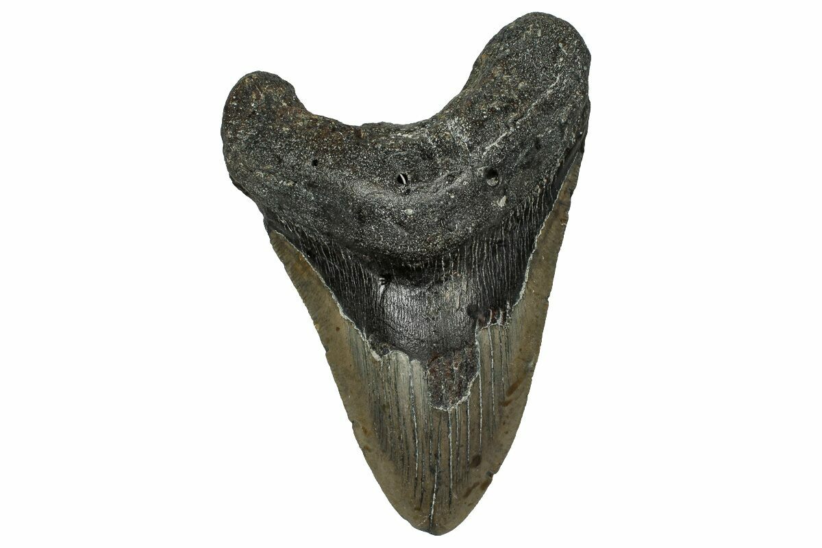 This is a large, 5.31" long megalodon tooth collected on the North Carolina coast. It was found by commercial divers collecting "the ledges" in about 100 feet of water. It would have eroded out of the Pungo River Formation putting its age in the range of 13.8 to 16 million years old. A tooth of this size would have come from a prehistoric mega-shark in the 40 foot size range.