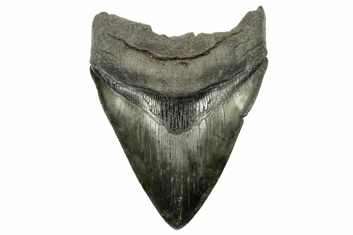 The standard measure for megalodon teeth is slant height, or the longest edge of the tooth. Adult megalodon teeth were typically in the 4 to 5 inch range: teeth over 6 inches are rare and represent super-sized individuals. Only a handful of teeth have ever been found over seven inches.
